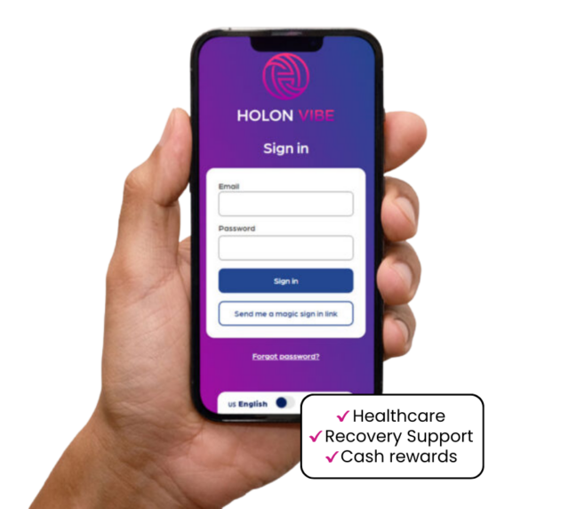 Access to recovery support, sobriety tracking, peer support, healthcare services, basic needs assistance, and cash rewards via the Holon Vibe app.